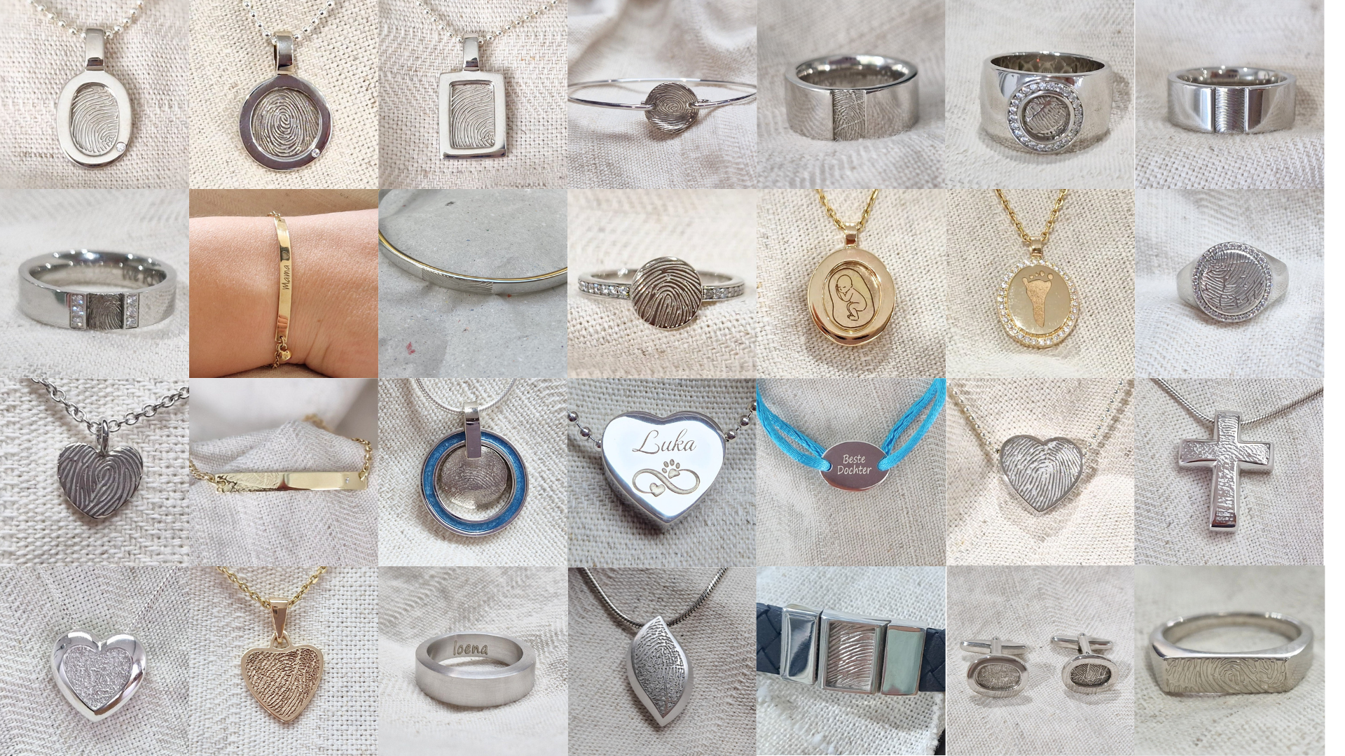 Gedenksieraden in uiteenlopende vormen en stijlen, die je kunt personaliseren met een vingerafdruk, handafdruk of pootafdruk van je huisdier. Daarnaast is het bij diverse sieraden mogelijk om een andere gravure te laten aanbrengen, zoals een symbool, familiewapen of een persoonlijk teken met speciale betekenis.
