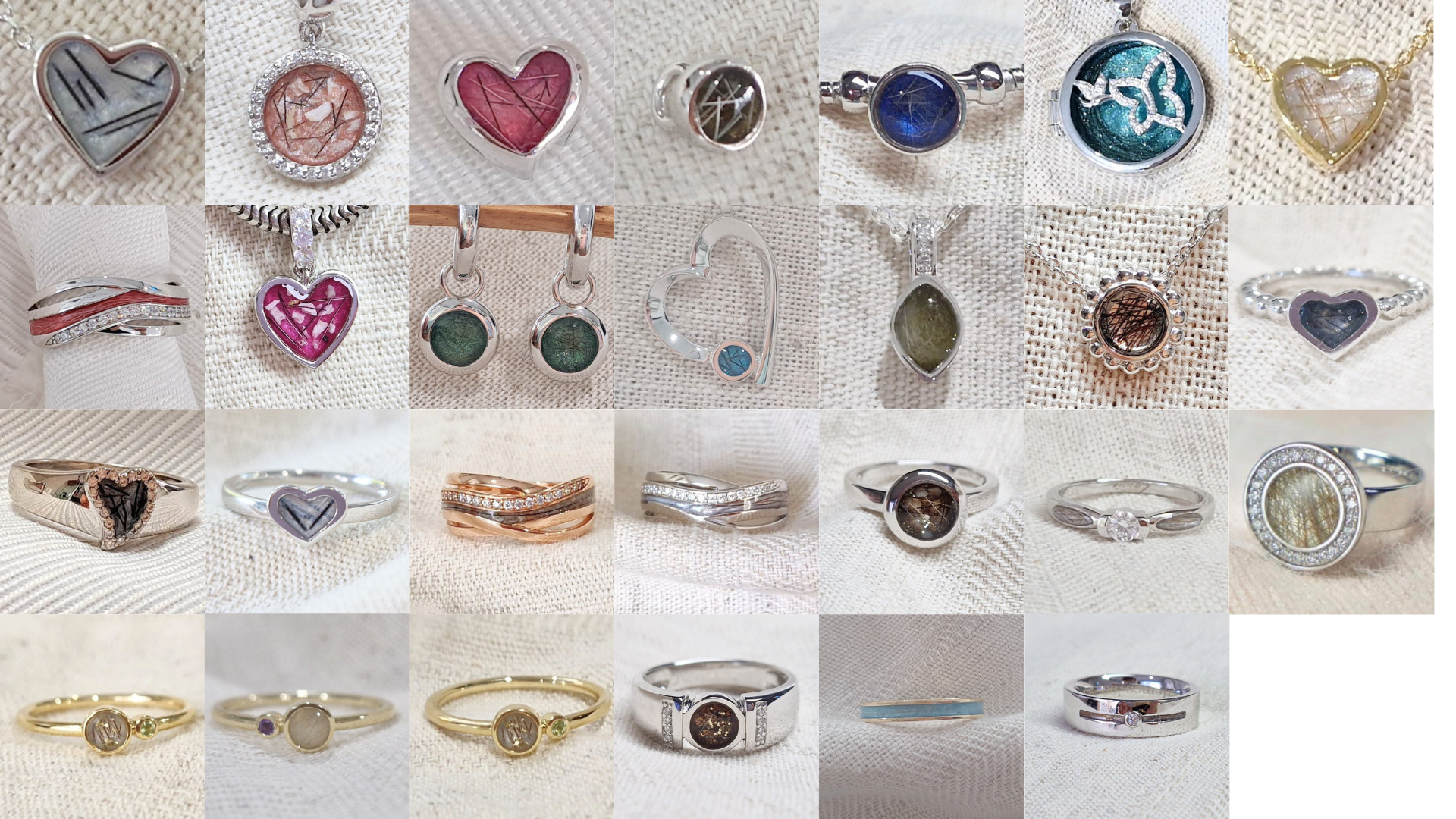 Sieraden met een ontwerp waarin as of haar zowel zichtbaar als onzichtbaar kan worden verwerkt, toegepast in diverse soorten gedenksieraden. Deze kunnen overzichtelijk worden gesorteerd in een submenu naar wens.